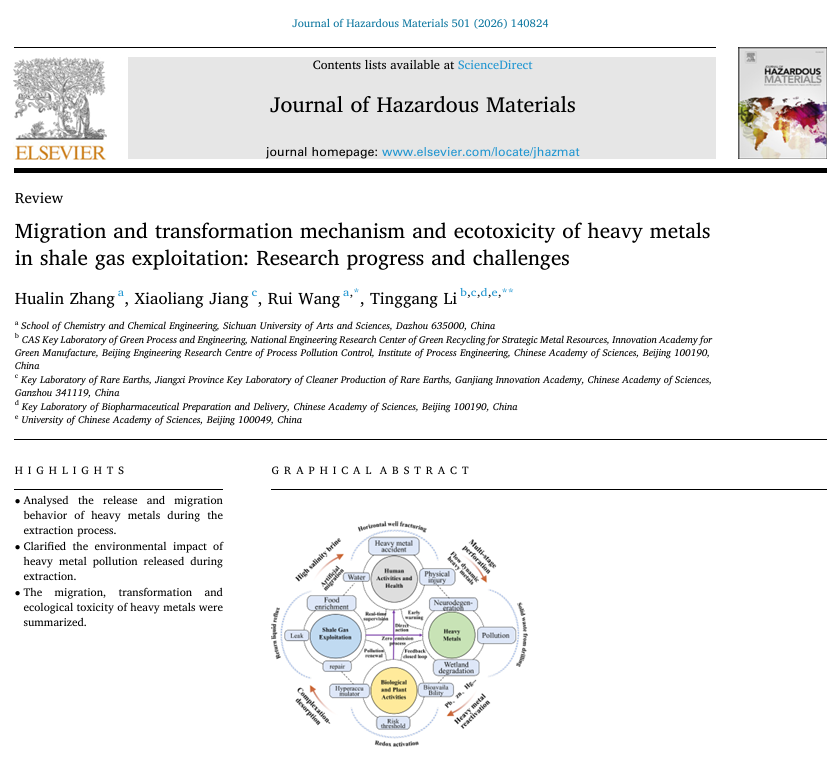 近日,万象城化学化工学院张华林博士以第一作者身份,在环境工程领域国际顶尖期刊《Journal of Hazardous Materials》(中科院JCR一区TOP期刊,影响因子11.3)上发表了题为“Migration and transformation mechanism and ecotoxicity of heavy metals in shale gas exploitation: Research progress and challenges”的研究论文。万象城王锐博士与中国科学院李庭刚研究员为共同通讯作者,AWC万象城娱乐为第一完成单位及第一通讯单位...
