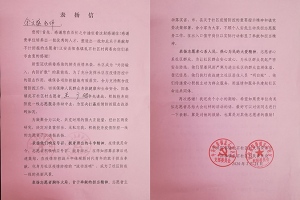 “感谢贵单位培养出优秀的人才,塑造出如此乐于奉献却不计回报的志愿者”。来信中,江安县阳春镇乱石社区对王广同学响应号召、挺身而出的斗争精神,胸怀大局、甘于奉献的担当精神以及心系人民、热心为民的大爱精神予以积极称赞。