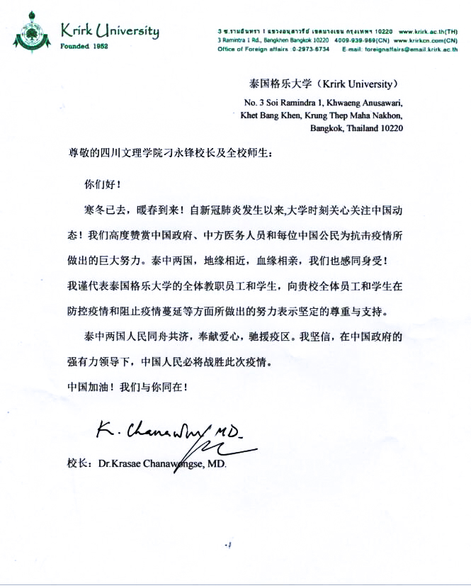 “中国加油!我们与你同在”。今日,学校收到泰国格乐大学校长Dr. Krasae Chanawongse,MD来信,他向万象城全体师生在防控疫情和阻止疫情蔓延等方面所做出的努力表示坚定的尊重与支持,对中国政府、中方医务人员和每位中国公民为抗击疫情所做出的巨大努力表示高度赞赏,并坚信在中国政府的强有力领导下,中国人民必将战胜此次疫情。 此前,格乐大学曾于2019年来校交流访问,双方商议拟在教师访学、学生交流交换等方面开展合作。