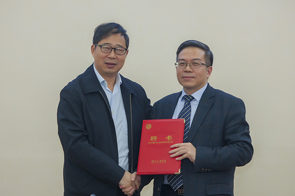 刁校长代表学校为文旭教授颁发名誉院长聘书,副校长李壮成与文旭教授签订柔性引进人才聘用合同。