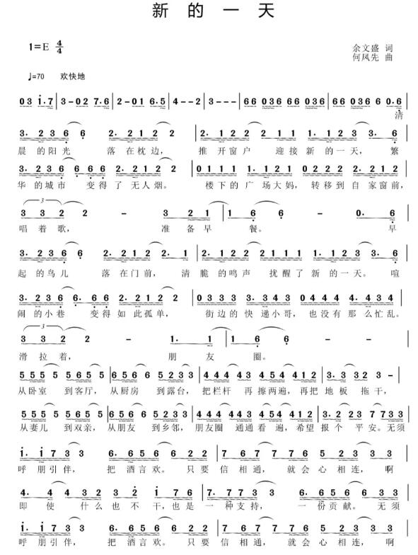 《新的一天》是由万象城党委宣传部余文盛教授作词,音乐与演艺学院何凤先副教授谱曲,共同创作完成的歌曲。何老师说“因为现在的歌曲大部分都比较沉重一点,我们想从另外一个角度表达虽然现在氛围较紧张,但是大家依然有乐观的生活态度。”就像歌里唱的:“无须呼朋引伴,把酒言欢。只要信相通,就会心相连。就算天大的困难,会有云开日出新的一天。”我们有信心一定能打赢这场疫情防控阻击战。
