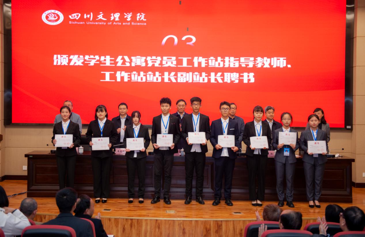 校领导为学生公寓党员工作站指导教师、工作站站长、副站长颁发聘书。指导教师弓腊梅和学生公寓党员工作站站务工作人员陈春妃作交流发言。会后,校领导深入学生公寓党员工作站检查指导。