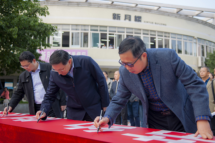 校领导在“厉行勤俭节约制止餐饮浪费”横幅上签名