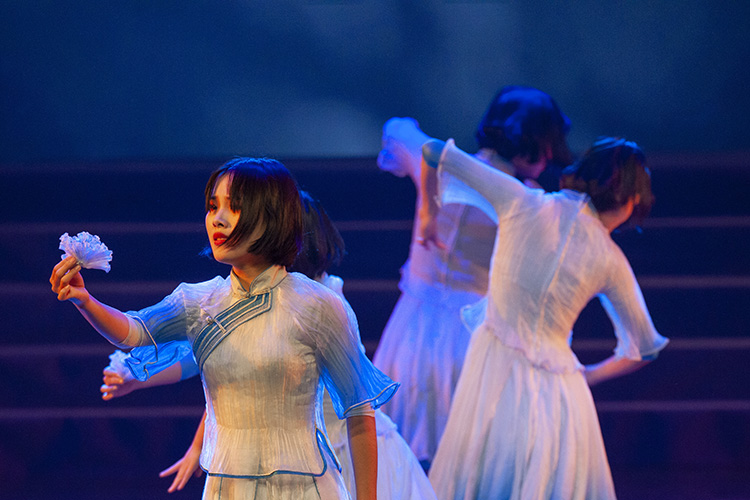 乐山师范学院舞蹈《战火中的青春》、泸州职业技术学院舞蹈《小白花》、四川大学舞蹈《到祖国最需要的地方》渐次精彩绽放,表达了青年大学生传承革命精神,书写时代华章,绽放最美青春的理想抱负和远大志向。