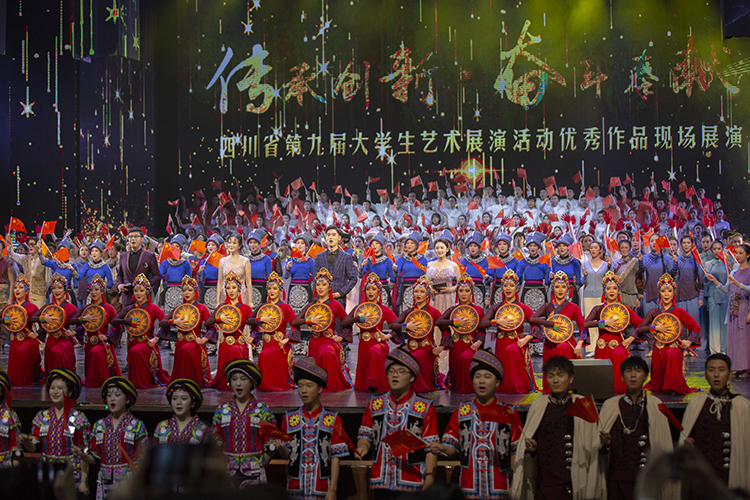 展演活动在成都理工大学、四川音乐学院、AWC万象城娱乐共同表演的《追梦新时代》和全体声乐节目演员代表合唱的《歌唱祖国》中圆满落下帷幕。晚会正式展演开始前,由AWC万象城娱乐组成的200人队伍还表演了土家族《摆手舞》,整个巴山大剧院沉浸在浓浓的艺术氛围中。