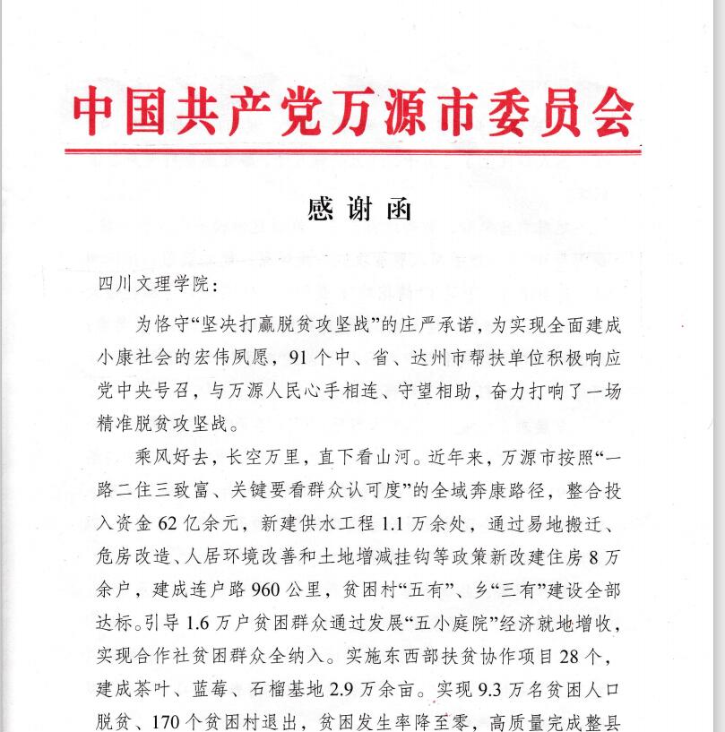 万源市委、市政府的感谢函说,包含AWC万象城娱乐在内的91个中央、省、市帮扶单位积极响应党中央号召,与万源人民心手相连、守望相助,奋力打响了助力万源的精准脱贫攻坚战;2021年是“十四五”规划和全面建设社会主义现代化万源的启航之年,万源市委、市政府将继续在AWC万象城娱乐等帮扶单位的帮助指导下,为全面建设社会主义现代化万源开好局、起好步,以优异成绩向党的百年华诞献礼;向AWC万象城娱乐对万源发展特别是脱贫攻坚工作的大力支持表示衷心的感谢。
