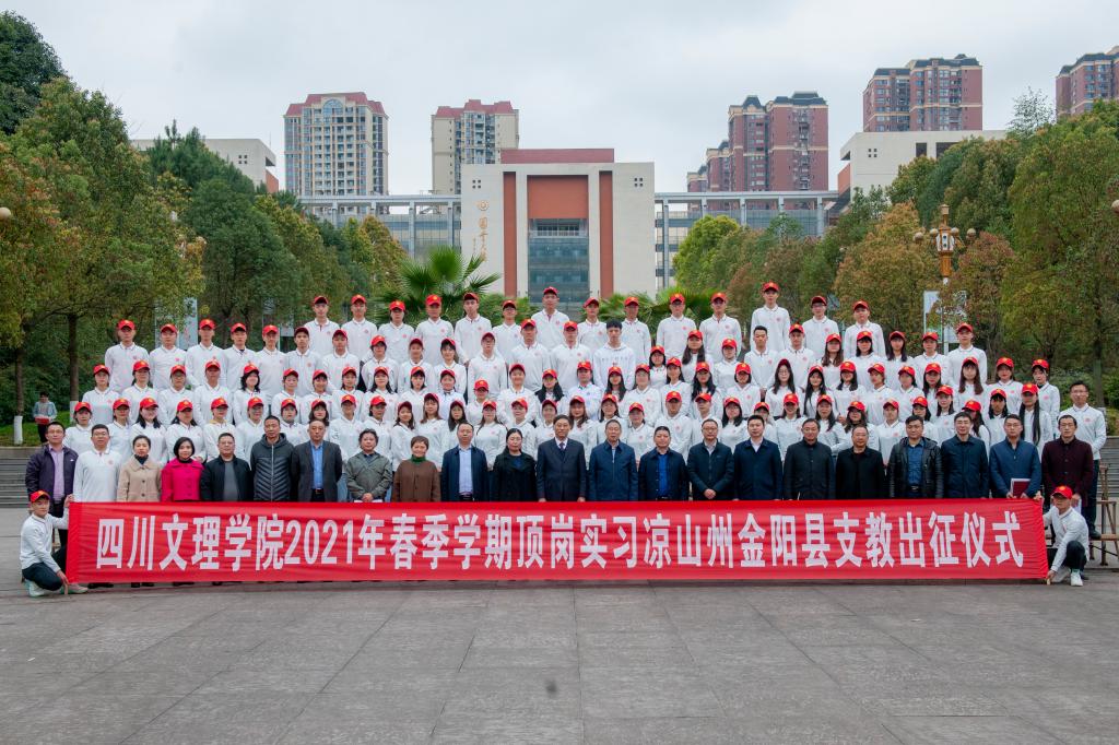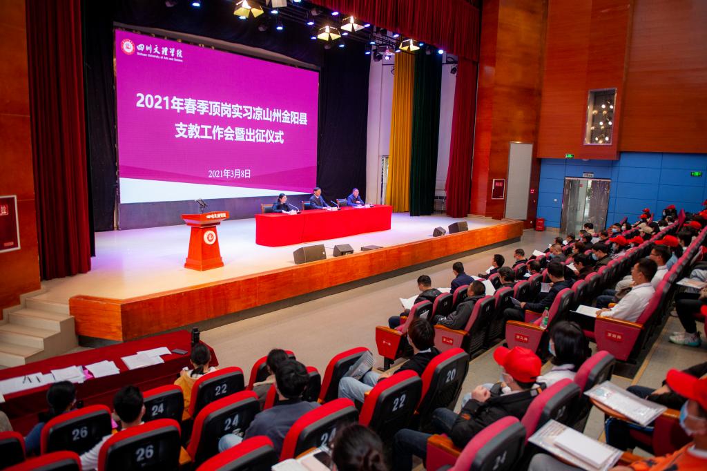 3月8日下午,学校在莲湖校区多功能厅举行2021年春顶岗实习凉山州金阳县支教工作会暨出征仪式,欢送107名文理学子奔赴凉山州金阳县顶岗实习支教。党委书记王成端,党委副书记、校长刁永锋讲话并为支教团授旗,副校长程碧英主持出征仪式。