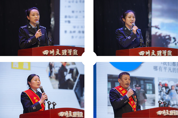 宣讲报告会上,讲述人讲述的英模有的在打击犯罪、保护人民生命财产安全的关键时刻挺身而出、冲锋在前,有的在抗洪抢险、维护社会安全稳定面前不怕疲劳、连续奋战,有的在重大险情、排爆处突面前主动请缨、不怕牺牲,有的在平凡的岗位上默默奉献、甘当无名英雄,有的像老黄牛一样辛勤耕耘,当好“螺丝钉”。讲述人以声情并茂的语言,配以图文和视频,从不同的角度,以不同的身份,展现了公安英模感人至深的画面,引起了师生的共鸣,激发了对英模的无限崇敬之情,并表达了向公安英模学习的意愿。