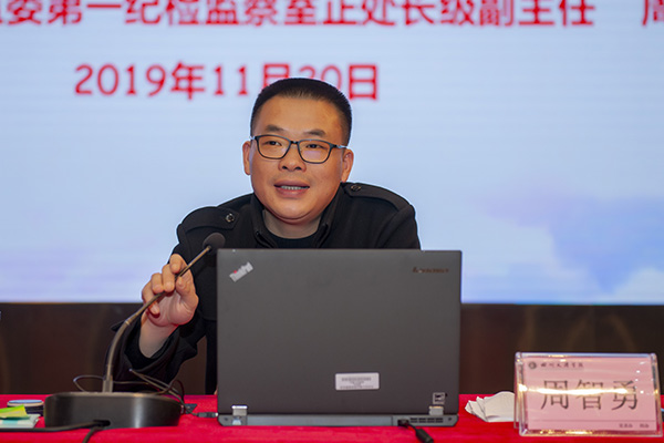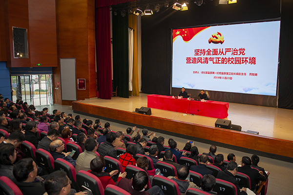 周智勇紧紧围绕中央和省委关于全面从严治党的决策部署,结合高校违纪违法典型案件,从问题所迫、使命所系、发展所需、家庭幸福所在四个方面阐释“为什么”要纵深推进全面从严治党;从政治上跟党走、经济上不伸手、生活上不出丑、安全上不裂口、工作上创一流五个方面明确高校纵深推进全面从严治党的检验标准;从坚持组织严管、领导帮带、制度约束、个人修为四个方面指明高校纵深推进全面从严治党的依靠。他希望,广大党员干部在“不忘初心、牢记使命”主题教育中,树牢“四个意识”,坚定“四个自信”,做到“两个维护”,进一步提高政治站位,勇于担当作为,为培养德智体美劳全面发展的社会主义建设者和接班人贡献智慧和力量。