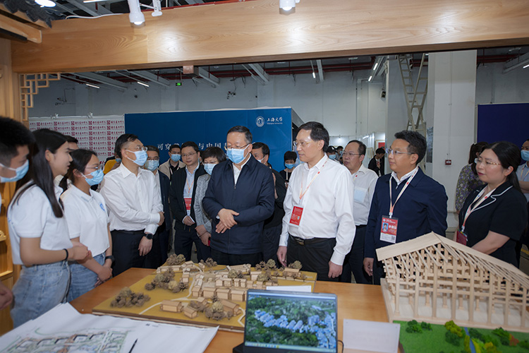 王成端向田学军、罗强等介绍了学校坚持美育特色培养应用型人才的举措。他说,学校近年来紧密结合地方经济社会发展,着力加强创新型复合型人才培养力度,组织师生积极参与乡村振兴战略,此次展出的艺术实践工作坊较好地体现了学校大美育成果,是学校一直重视美育教育的缩影,也较好地展现了川东传统民居建筑风貌特色,具有较广阔的发展应用前景。他希望,同学们继续加强专业知识学习,将理论知识与专业实践有机结合起来,把乡村振兴这篇文章书写得更好、更美。
