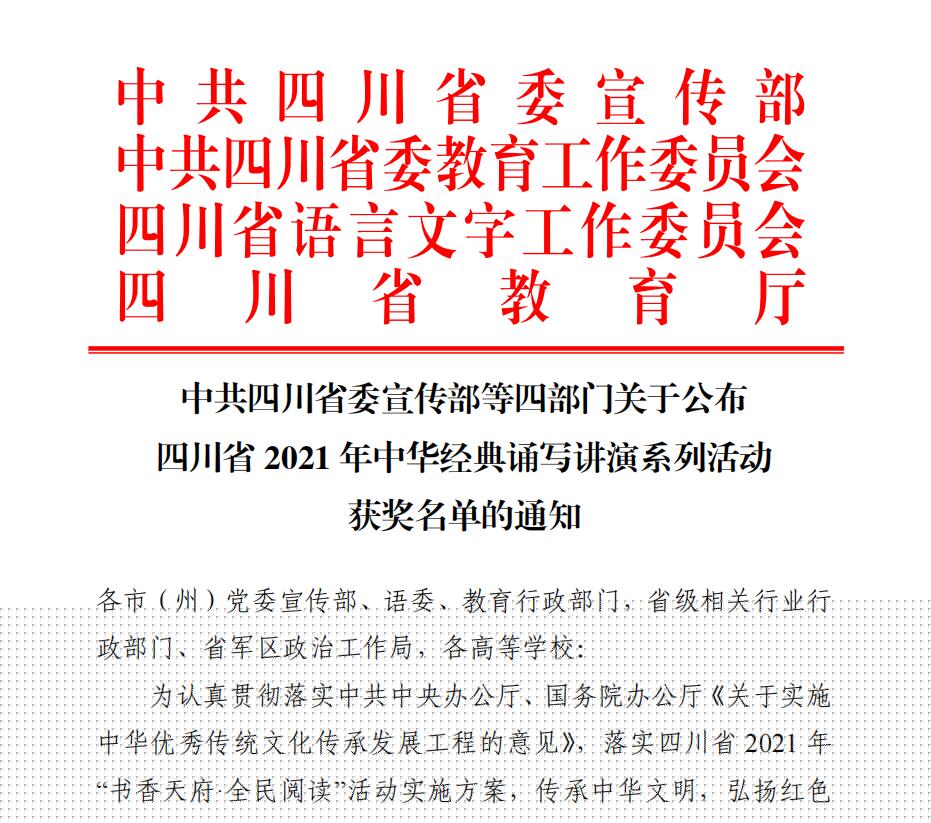 10月12日,省委宣传部、省委教育工委、省语言文字工作委员会、省教育厅联合《公布四川省2021年中华经典诵写讲演系列活动获奖名单的通知》,万象城在今年比赛中,共报送35件作品参赛,26件作品获奖,其中获一等奖3件、获二等奖2件、获三等奖9件、优秀奖12件,在全省高校中取得了较好的成绩。