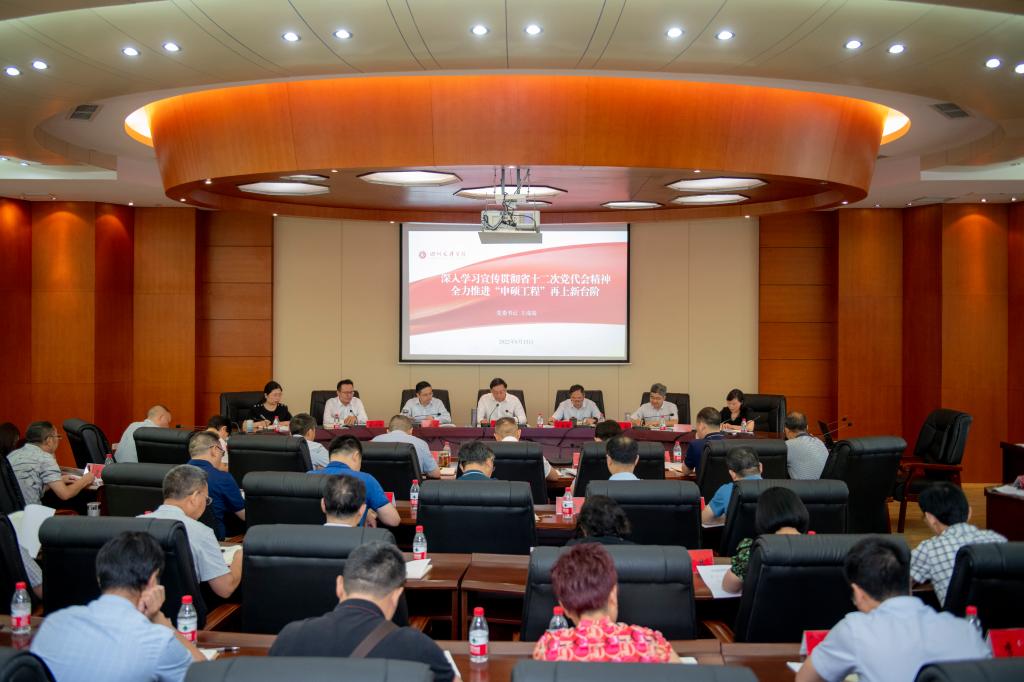 王成端要求,全体党员领导干部要学深悟透省十二次党代会精神,在学校“申硕工程”战略全局牵引下,主动思考各项事业如何全面对接、落实落细省第十二次党代会精神,从而凝聚共识,集中力量推进“申硕工程”再上新台阶。一是要抓实抓好市校战略合作历史机遇,不断增强“机不可失、时不再来”的战略清醒认识和“顺势而为、乘势而上”的历史主动精神。聚焦市校合作“两规划两方案”的精准对接、全力推进,形成“时时有往来、月月有进展、件件有着落”的市校合作工作氛围和热潮,着力在全面助推达州融入“双城圈”建设,强力推进“示范区”创建,协同实施“副中心”培育,落实省委“一干多支、五区协同”的战略部署上找准着力点,彰显学校全面服务地方经济社会发展的担当与作为。二是要对标对表硕士学位授权单位建设指标体系,持续在“思想同心、行动同步”上下功夫。全校上下要对申硕之于学校发展战略全局的重要意义有着清醒认识,达到思想上的高度统一,做到心往一处想、智往一处谋、劲往一处使,人人谈申硕,人人想着为申硕出谋划策、贡献力量,相关职能部门要不断细化和推进申硕“任务书”“时间表”“作战图”的落地落实,全力推动学校“申硕工程”高标准完成阶段目标任务,为如期实现申硕突破不断奠定坚实基础。三是要做实做强学科专业建设,持续在“全面提速、整体成势”上下功夫。不断强化学科建设是大学发展的动力源泉,也是大学核心竞争力的重要体现,优势学科被誉为高校发展的利剑,是高校办学之本、教学之基的思想认识。着力在优化学科建设布局,落实学科建设责任制,深入实施学科建设“四大工程”,加强“八大学科专业群”建设,抓实“对标竞进”活动实现多点突破。四是要在引才用才上大胆创新,持续在“不拘一格、引才育才”上下功夫。要深入贯彻落实中央、省委人才工作会议精神,坚持和加强党对人才工作的领导,抓实“引、育、稳、用、服”工作,深入调研分析高层次人才引育的重点、难点问题,争取各方资源,在人才引进政策机制上做到切中要害,凸显学校比较优势;五是要持续加强科学研究,着力在“多点发力、重点突破”上下功夫。努力在全校上下营造科学研究的浓厚氛围,创新举措推动重大项目不断实现新突破。推进科研体制机制改革,持续加强科研平台团队建设,深入推进“产教研学用”一体化改革,加大标志性成果培育力度,多措并举,真正实现学校科学研究跨越式发展,提升科研服务地方经济发展能力。