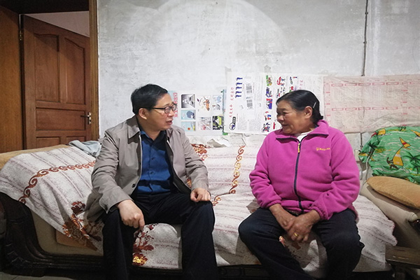王成端一行到达柏树坝村后不顾疲劳随即分头入户开展活动。王成端来到帮扶对象刘德明家中,实地查看吃、穿、住、用等情况,详细了解是否存在“两不愁,三保障”突出问题,并通过大数据平台APP一一核对各种信息,认真填写调查表。刘德明激动地说:“感谢党和国家的好政策,关心普通老百姓。感谢王书记,一直这样关心、惦记、帮助我。”王成端说:“为人民服务是我们党的宗旨,关心群众、爱护群众是我们的职责所在,希望你保重身体,日子越过越好。”