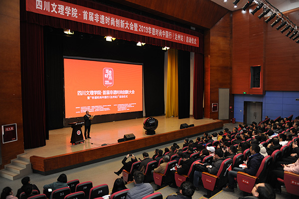 王晖分享了自己通过22年的学习,传承与发展蜀绣所做的探索,提出了非遗时尚化的建议和措施。她现场讲解蜀绣的部分技法和精美绝伦的作品,让在场的观众叹为观止。她将蜀绣运用到不同的载体上,进行创新融合,让观众体验了蜀绣艺术的传统之美。刘承川教授就石桥火龙非遗艺术认为,文化产业要发展,对于文化资源丰富的达州地区来说,必须实施资源驱动战略,达州非遗的视觉元素,超级IP未来一定有很多出自于这些具有地方特色和文化特征的非遗资源宝库。蔡励才在演讲中传达了 “先有文化生态,再有非遗传承”的理念。他表示,“2019非遗时尚中国行”系列活动将把具有代表性的传统非遗文化元素进行提炼,结合当代美学,进行时尚创作设计,打造非遗时尚图案IP,通过聚合各路媒体、时尚明星大咖、公益机构以及各互联网平台,整合资源和力量,把非遗时尚IP化,实现非遗的创造性转化及创新性发展。许建斌表达了新一代青年群体对中国传统文化传承和发展的坚定态度和责任担当,同时向万象城师生发出星青年校园创客召集令,号召青年师生加入非遗时尚创客行列,用更时尚的手段助推中国非遗时尚复兴。