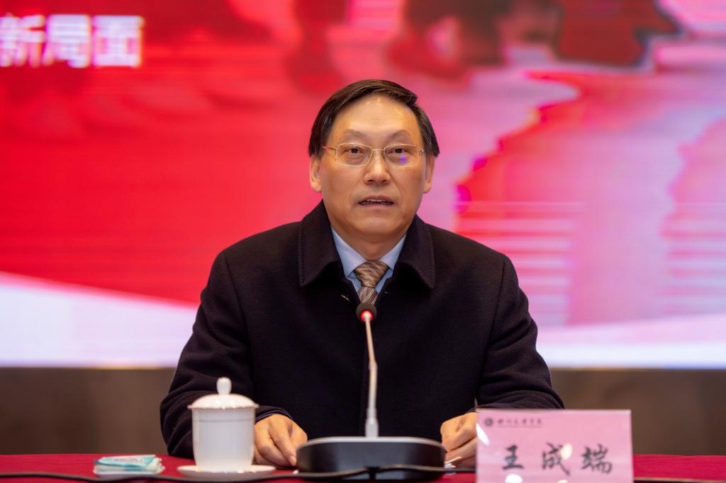 王成端在主题报告中指出,中央和省委作出的重大决策部署和战略安排,赋予教育、特别是高等教育新的战略地位、历史使命和发展格局,为我们做好工作指明了方向、提供了遵循,我们要认真学习领会、抓好贯彻落实。一要坚持党的领导,把牢事业发展方向之舵。要着眼凝心铸魂持续强化创新理论武装,着眼政治忠诚突出加强党的政治建设,着眼守正创新扎实抓好意识形态工作,着眼强基固本全面提升党建工作质量,着眼履职担当建设高素质干部队伍,着眼纪律规矩深入推进全面从严治党。二要坚持“四化同步”,加强优势特色学科建设。要强化服务需求导向,持续优化学科布局;加大学科建设力度,凸显学科特色优势;深入实施申硕工程,提升学科建设成效。三要坚持“城乡融合”,努力提升人才培养质量。要加快构建高质量本科教育体系,努力提升教师教育教学能力,深入推进创新创业教育改革,着力健全完善质量保障体系。四要坚持“五区共兴”,全面提升服务社会发展能力。要充分发挥“万达开川渝统筹发展示范区高校联盟”的作用,加快打造高能级科研平台,持续深化拓展校地合作内涵。