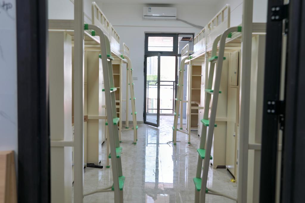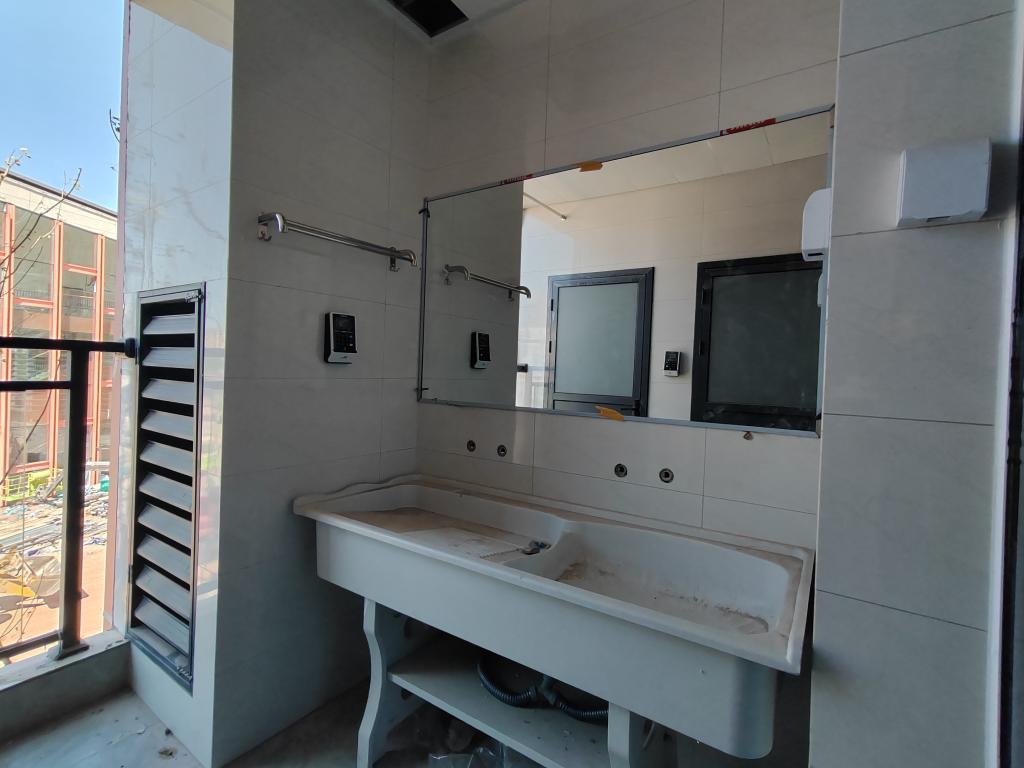 食堂的对面就是3幢学生宿舍,六层楼有超过5000个床位,全部是6人间,设有双卫生间、双洗漱区搭配整面洗漱镜,配备了空调,有阳台晾晒区。每层楼还设立了公共卫生间和行动不便学生专用卫生间,更有宽敞的学生活动区。3幢宿舍共配备了12部电梯。宿舍区楼下还有生活超市及其他便民设施。