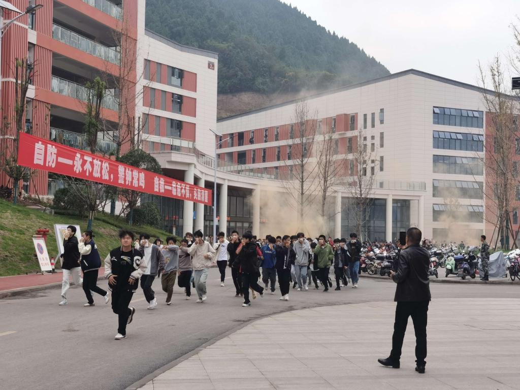 在灭火救援实操环节,学校邀请达州巴山救援队来校为安保人员、食堂员工、公寓管理员、在建工地员工及各二级学院学生代表开展火场灭火救援培训,巴山救援队技术总工刘虹曙详细讲解并演示了火场灭火救援注意事项及基本救援技能。参培师生代表在巴山救援队的指导下,分组进行灭火救援实操体验,通过快速响应、有效应对、科学处置,参培师生完成了规定动作,达到了预期效果。应急疏散演练环节模拟学生公寓着火,现场通过燃放烟雾弹形式模仿真实环境。发现“火情”的宿管人员立即拨打校园110指挥中心及119报警电话,学校义务消防队紧急赶往事发现场组织前期扑救,并协助达州消防、巴山救援队专业人员开展抢险救援,有效组织学生快速有序地疏散至安全区域。参演学生牢记火场逃生要领,用湿毛巾捂住口鼻,沿着预定的疏散路线快速撤离到各自指定的区域集合,整个疏散演练用时4分钟,做到了科学、快速、安全、有序。