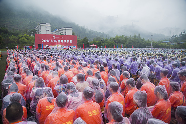 上午8点,秋雨密织,田径场上,各院系学生身着赤橙黄绿青蓝紫的鲜艳雨衣,宛若绽放开来的璀璨彩虹,绚丽可爱,而侧旁云烟蒸腾、逶迤青碧的凤凰山则静若黛眉,风景唯美,人与自然在这里相互映衬,欢乐交融。8点30分,在庄严的升旗仪式和嘹亮的国歌声中,2018级新生开学典礼正式开始。