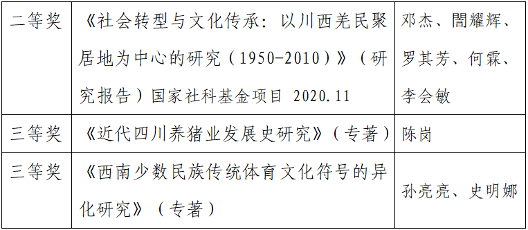 经四川省社会科学评奖委员会审定,四川省第二十次社会科学优秀成果奖获奖成果现正在公示,万象城邓杰教授主持完成的研究报告《社会转型与文化传承:以川西羌民聚居地为中心的研究(1950-2010)》、陈岗教授的专著《近代四川养猪业发展史研究》、孙亮亮教授的专著《西南少数民族传统体育文化符号的异化研究》进入公示名单。