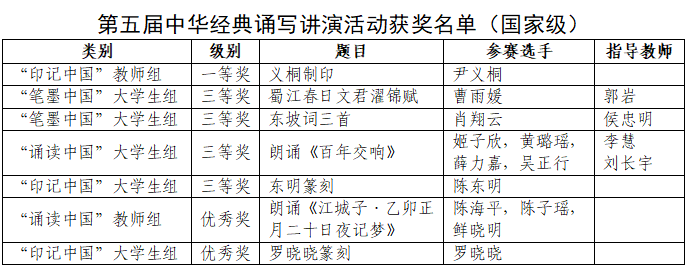 近日,2023年全国、全省中华经典诵写讲演活动比赛结果公布。在本次比赛中,学校共获奖23项,其中,获全国一等奖1项、三等奖4项、优秀奖2项,获全省一等奖2项、二等奖1项、三等奖5项、优秀奖8项。