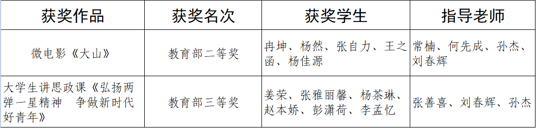 近日,由教育部高校思政课教学指导委员会主办的第七届“我心中的思政课”全国高校大学生微电影展示活动评选结果揭晓。万象城马克思主义学院团队制作的原创微电影《大山》、大学生讲思政课《弘扬两弹一星精神 争做新时代好青年》两项作品分别获教育部二等奖和三等奖。