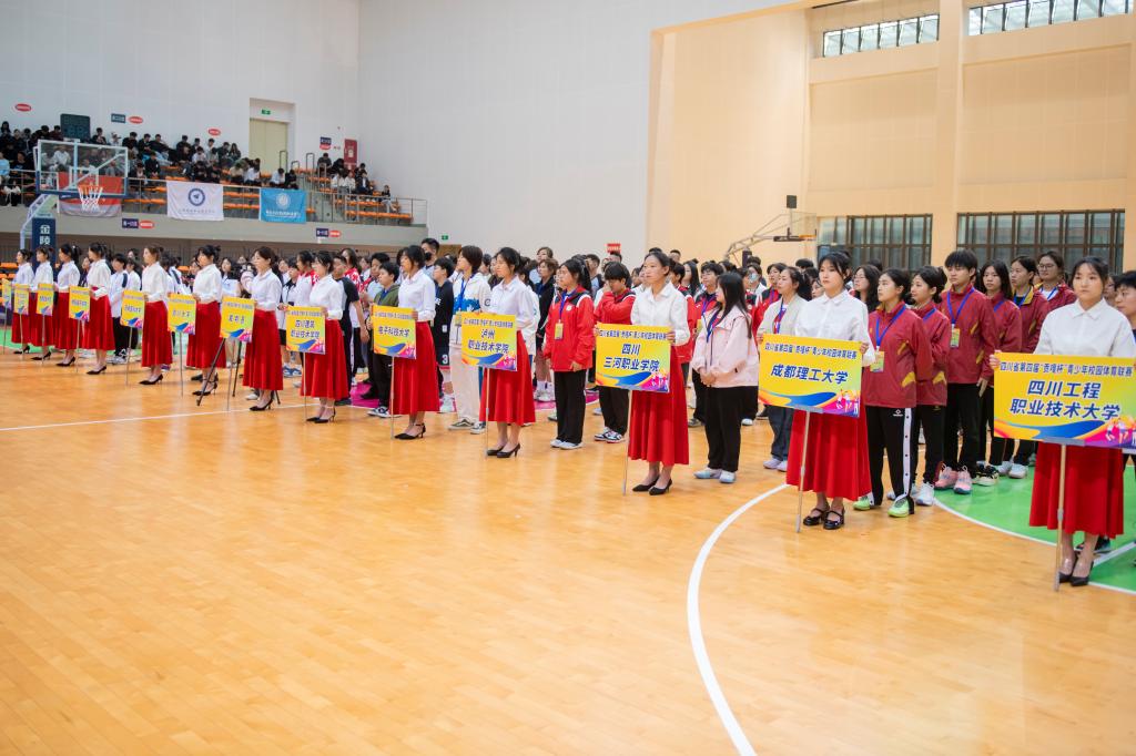 4月25日,四川省第四届“贡嘎杯”青少年篮球联赛高校女子校园组总决赛在万象城莲湖校区体育馆开幕。四川省教育厅体卫艺处干部陈小剑、四川省大学生体育协会副会长景志辉、学校副校长程碧英、四川省大学生体育协会竞赛部部长吕志刚、四川省大学生体育协会篮球专项负责人李春晖,以及比赛监督、技术代表和裁判等出席开幕式。开幕式由体育学院院长佘涛主持。