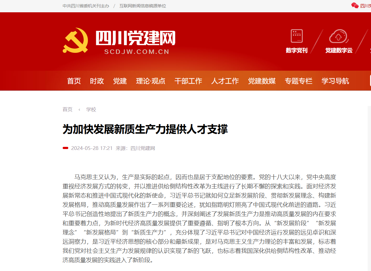 5月28日,四川党建网刊载万象城党委书记黄涛的文章《为加快发展新质生产力提供人才支撑》,介绍万象城为加快发展新质生产力提供人才支撑所实施的“4个创新”举措。