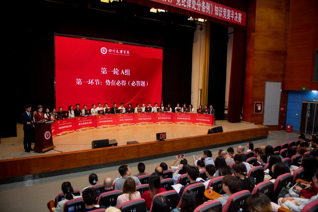 为深入学习贯彻习近平新时代中国特色社会主义思想,扎实开展好党纪学习教育,强化全校党员党纪党规学习,5月29日,校纪委办公室与党委宣传部联合举办了主题为“清韵润文理,条例大家学”的《中国共产党纪律处分条例》知识竞赛(半决赛)。来自十六个二级学院党委、机关党委、后勤&离退休&图书馆三个党总支共组成的18支队伍,54名参赛人员参赛。比赛特别邀请了政法学院/知识产权学院党委书记岳臣忠、副书记刘良训和徐寅智博士组成专家组答疑组,设立计分组,保证比赛的公平与公正。
