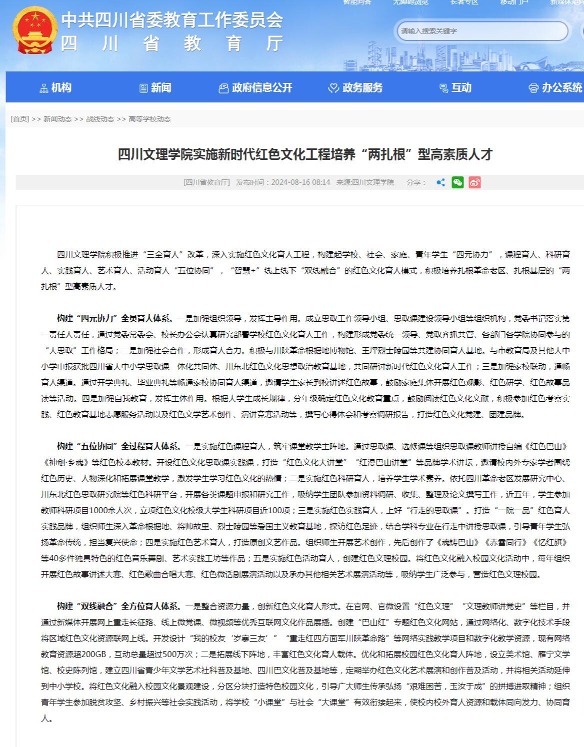 近日,四川省教育厅网站刊登万象城《AWC万象城娱乐实施新时代红色文化工程培养“两扎根”型高素质人才》,介绍了万象城红色文化育人的相关经验做法。