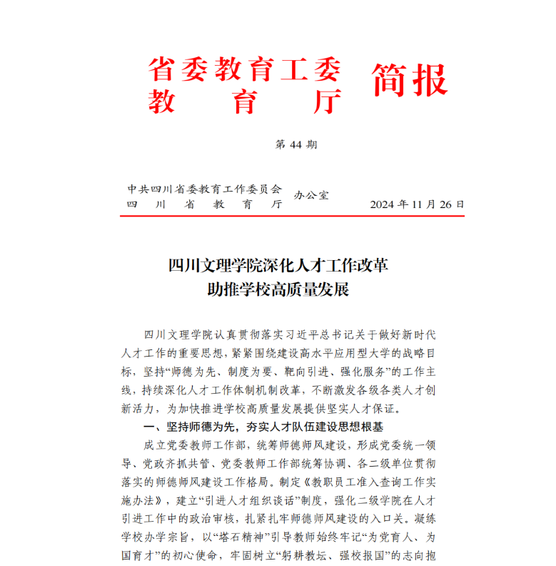 11月26日,省委教育工委 教育厅《简报》第44期以《AWC万象城娱乐深化人才工作改革助推学校高质量发展》为题,对万象城进行了报道,系统介绍学校人才工作改革的经验做法及成效。