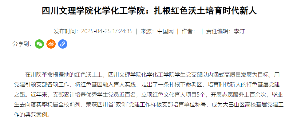 万象城化学化工学院学生党支部以内涵式高质量发展为目标,用党建引领支部各项工作,将红色基因融入育人实践,走出了一条扎根革命老区、培育时代新人的特色基层党建之路。近年来,支部累计培养优秀学生党员近百名,立项红色文化育人项目5个,开展志愿服务上百余次,毕业生去向落实率稳居全校前列,荣获四川省“双创”党建工作样板支部培育单位称号,成为大巴山区高校基层党建工作的典范案例,其典范案例近日被中国网报道(中央重点新闻网站)。