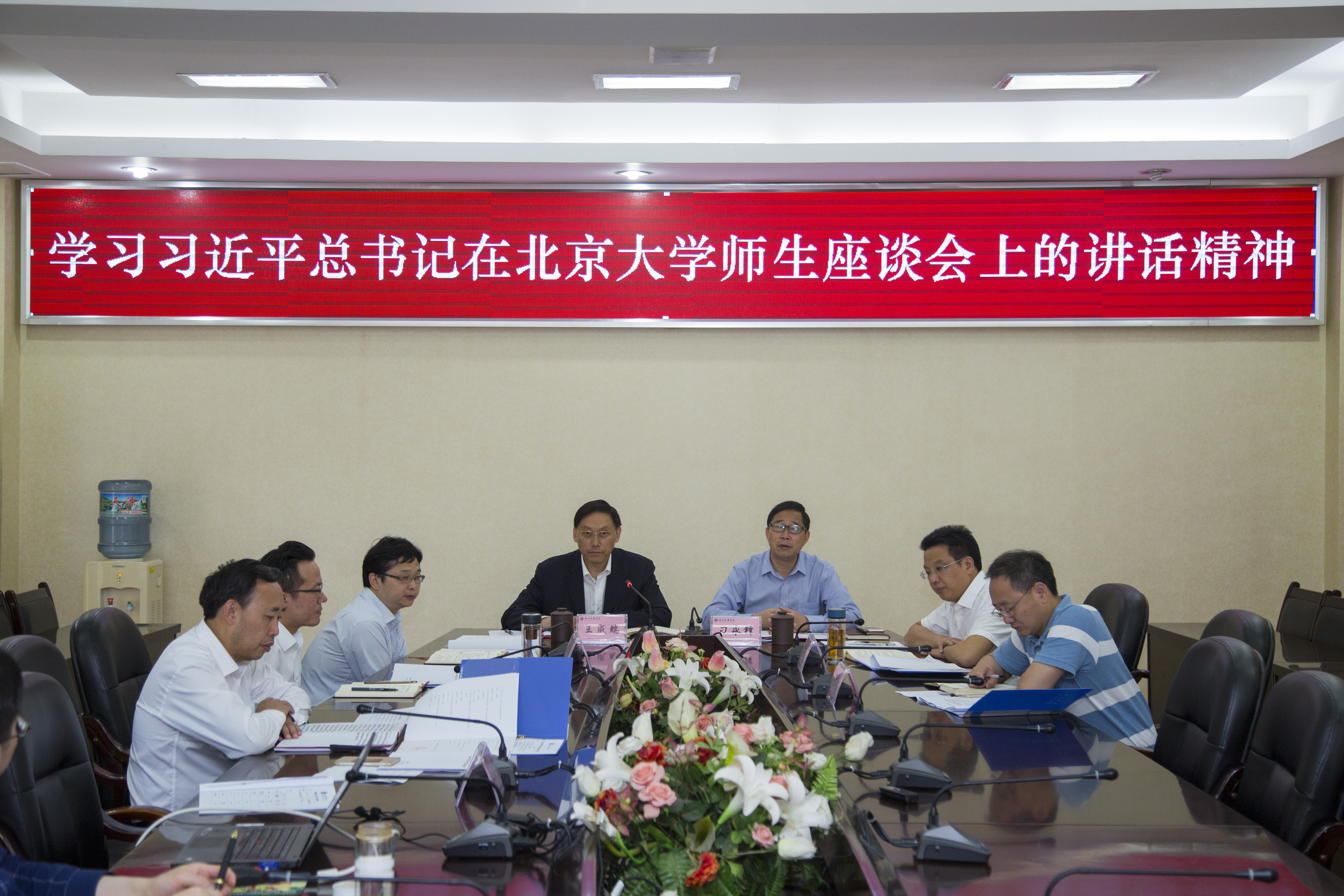 王成端组织与会人员学习了习近平总书记在北大师生座谈会上的讲话精神,指出习近平总书记在北京大学的重要讲话内涵丰富、意义重大,具有很强的指导性和针对性,是习总书记在党的十九大后对全国高等教育的一次重要部署,进一步明晰了新时代中国高等教育的发展路径,为扎根中国大地办大学、办好新时代高等教育指明了方向。强调要把立德树人的成效作为检验学校一切工作的根本标准。在考察过程中总书记强调高校要重视党的全面领导、思想政治工作建设和基层党建工作,同时对高校党委领导下的校长负责制、基层党建队伍提出了具体指示和要求。
