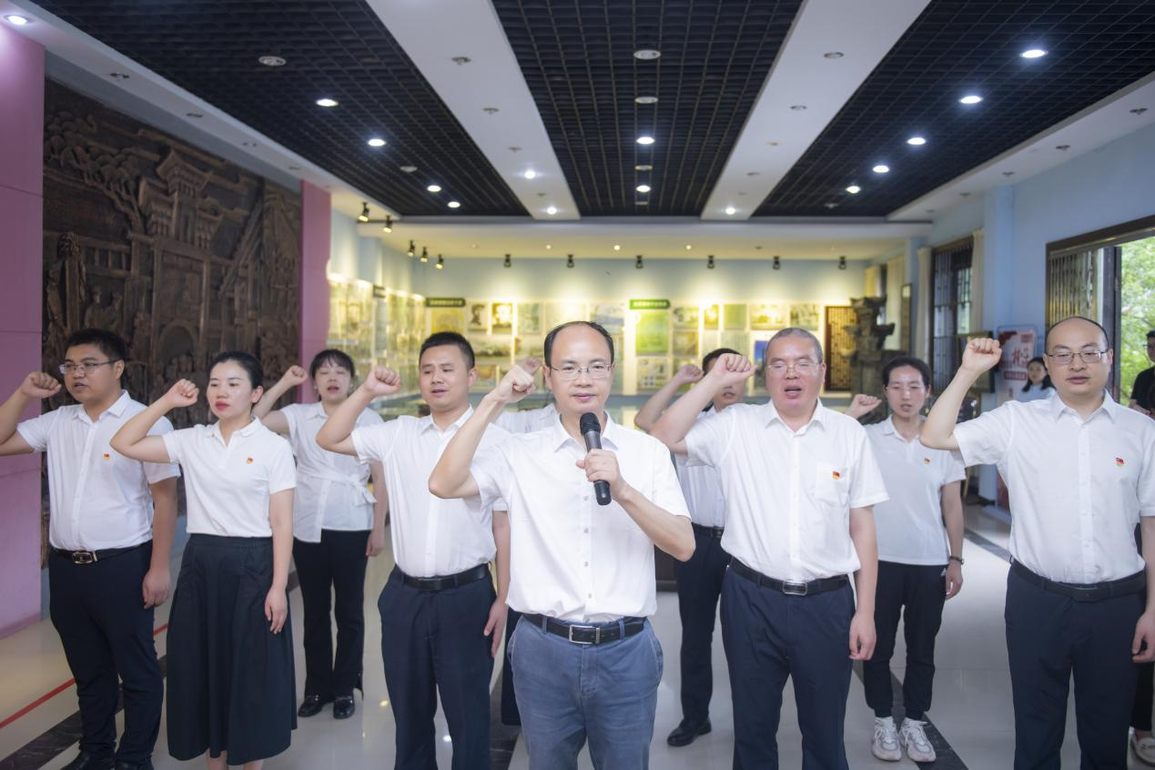 红军陈列馆内,一盏煤油灯、一件蓑衣、一把锈迹斑斑的大刀,将大家的思绪带回那段烽火岁月。特别是看到展柜中保存完好的《中国共产党十大政纲》石刻原件,党员们深刻感受到革命先辈“革命理想高于天”的坚定信念。在列宁街,讲解员动情讲述红四方面军在川陕革命根据地的英勇事迹,以及“列宁主义街”石刻标语镌刻的感人故事,党员们通过一幅幅珍贵的历史图片和红色标语,深刻感悟红军将士“敢教日月换新天”的斗争精神和不怕牺牲的革命奉献精神。在红军陈列馆内,党委书记黄涛带领全体党员重温入党誓词。