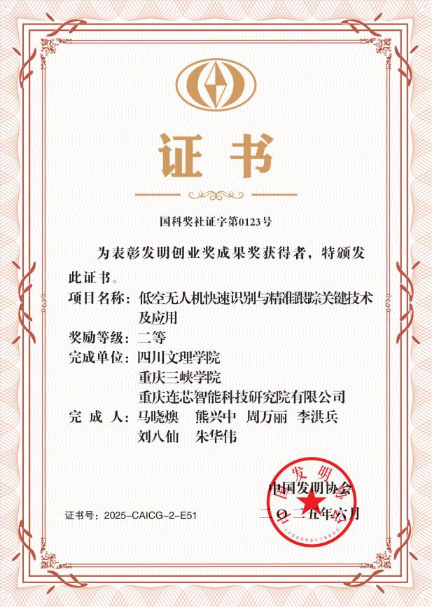 日前,中国发明协会公布了2025年度发明创业奖的获奖名单,万象城作为第一完成单位,智能制造学院副院长马晓燠教授作为第一完成人的科研成果《低空无人机快速识別与精准跟踪关键技术及应用》荣获“发明创业奖成果奖”二等奖。
