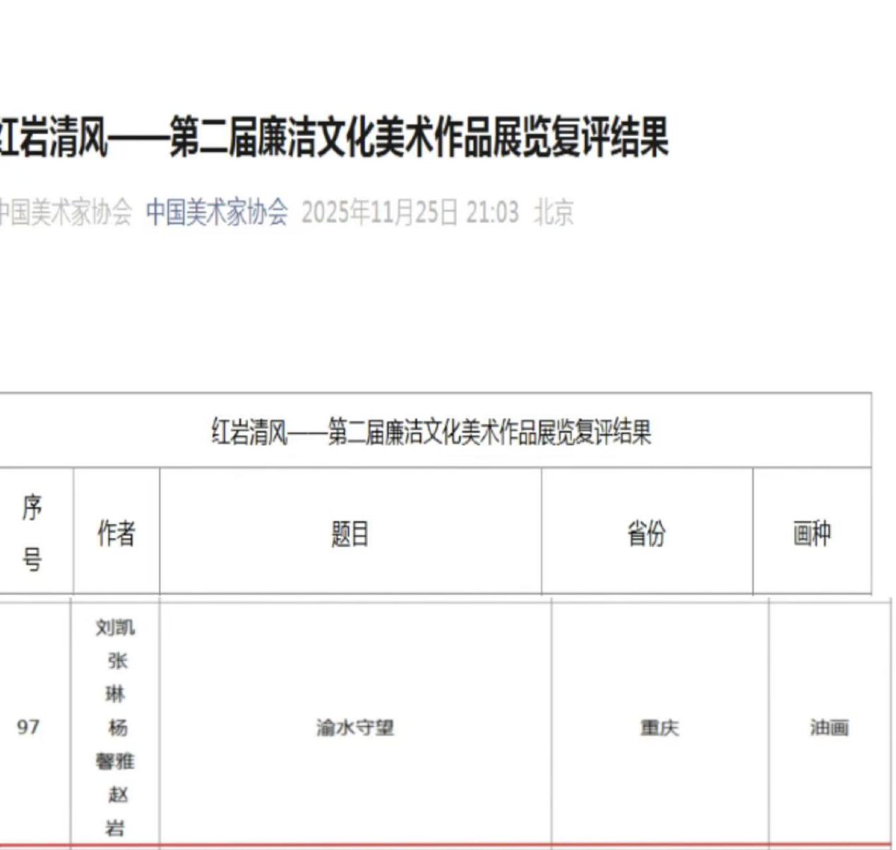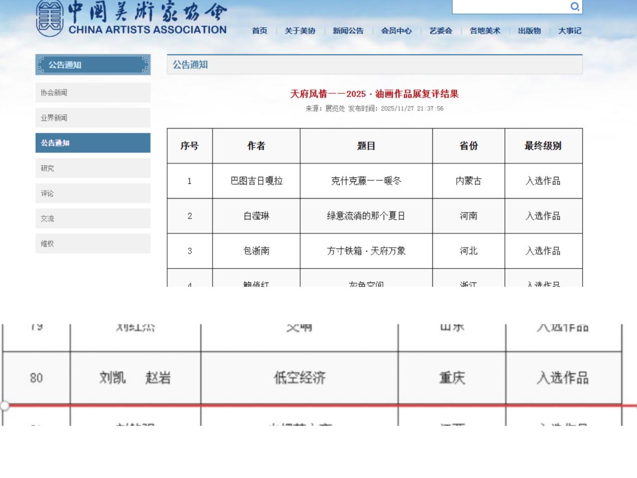 中国美术家协会作品展复评结果网页截图