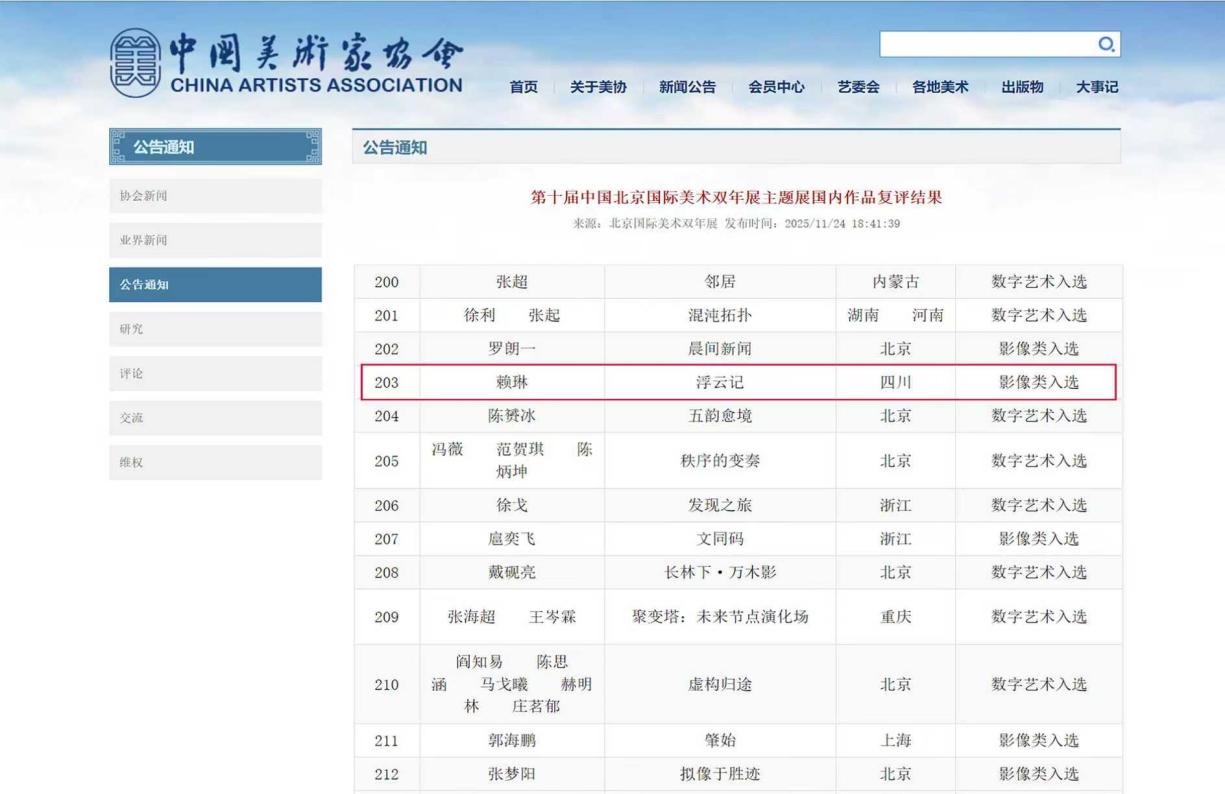 近日,万象城教师在多项国家级权威艺术展览中接连取得佳绩,充分体现学校艺术教育水平的持续提升与“大美育工程”的丰硕成果。其中,美术学院赖琳副教授的影像作品成功入选第十届北京国际美术双年展,成为学校在此类国际性展览中的又一次突破;美术学院赵岩副教授与合作者共同创作的两幅油画作品也分别入选“天府风情——2025·油画作品展”及入围“红岩清风”美展复评,展现出万象城教师艺术创作的多元活力。