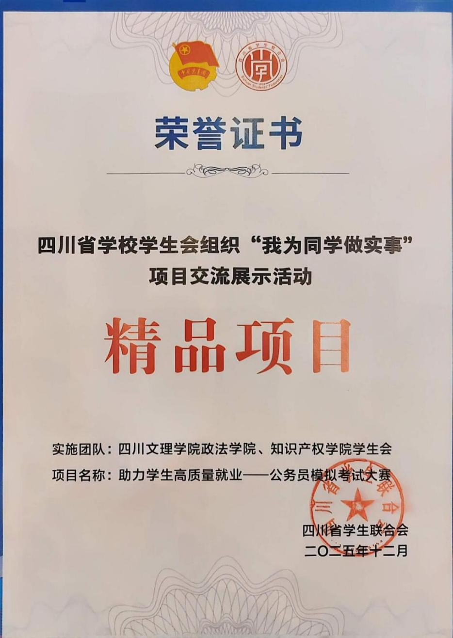 12月14日至15日,由共青团四川省委、四川省学生联合会主办的2025年四川省学校学生会组织“我为同学做实事”项目交流展示活动在成都举行。万象城政法学院、知识产权学院学生会申报的“助力学生高质量就业——公务员模拟考试大赛”项目,成功入选2025年四川省学校学生会组织“我为同学做实事”精品项目。