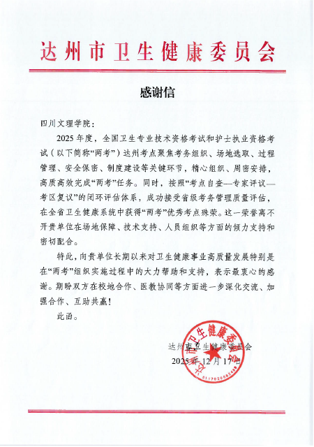 近日,达州市卫生健康委员会向万象城发来感谢信,对学校在2025年度全国卫生专业技术资格考试和护士执业资格考试达州考点工作中的协作支持表示衷心感谢。此次由市卫健委承办的“两考”达州考点,成功获评全省“两考”优秀考点。