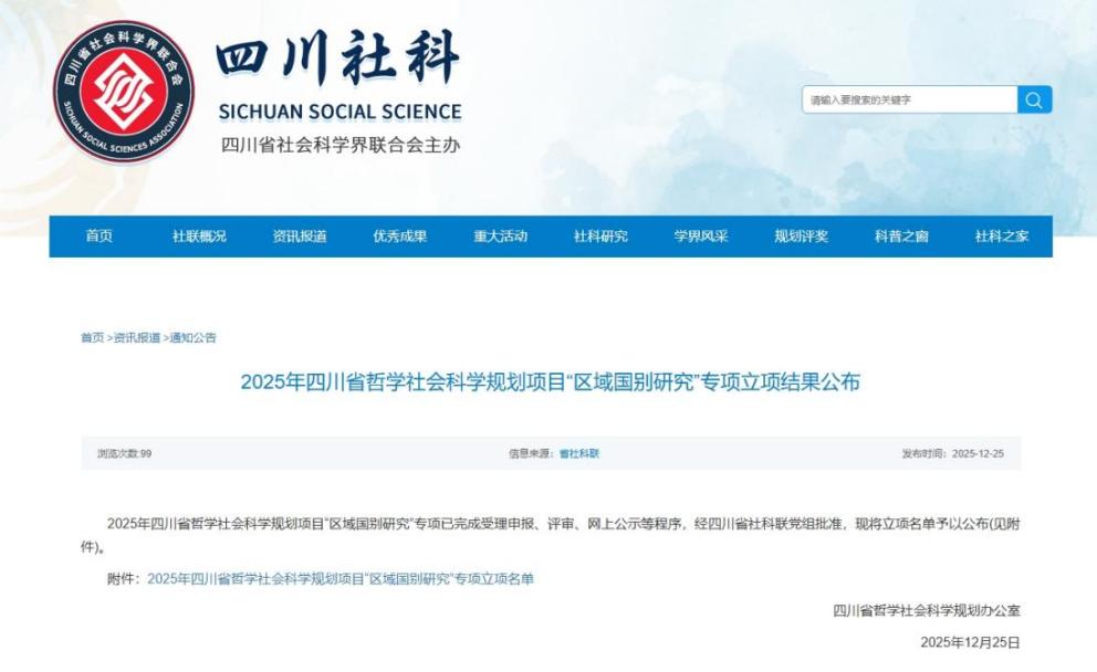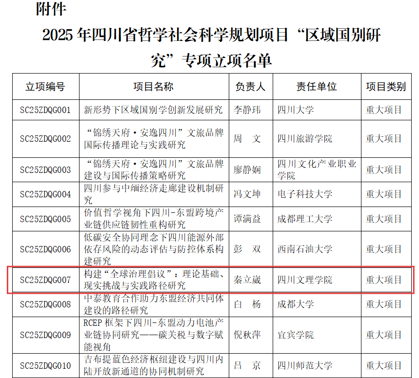 近日,四川省哲学社会科学规划办公室公布了“2025年四川省哲学社会科学规划项目‘区域国别研究’专项立项结果”,万象城秦立崴教授主持的《构建“全球治理倡议”:理论基础、现实挑战与实践路径研究》(项目编号:SC25ZDQG007)获批重大项目立项。