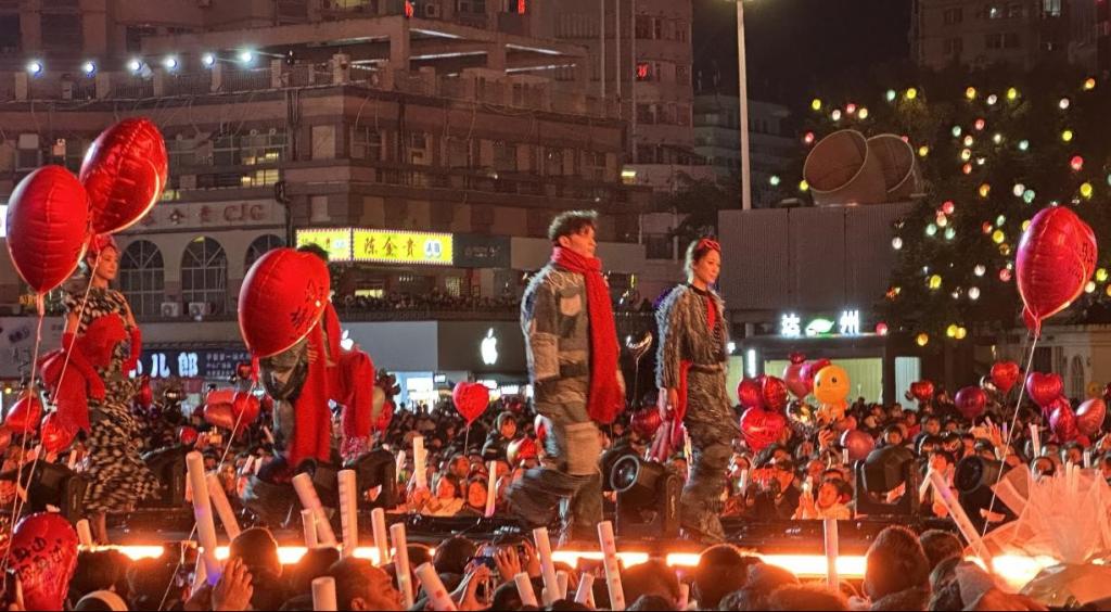 12月31日晚,“潮涌达州 爱满通川”2026跨年晚会在达州市中心广场隆重举行。在众多精彩节目中,万象城美术学院服装与服饰设计专业师生带来的6分钟服装走秀成为晚会亮点,千禧模特造型社的30位学生倾情演绎30套融合达州地域文化与非遗剪纸的原创服装作品,为观众呈现了一场视觉与文化交融的时尚盛宴。
