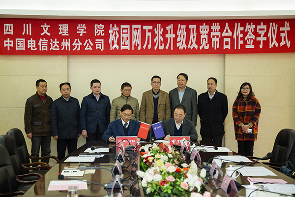 2月28日,学校与中国电信达州分公司共建“校园网万兆升级及宽带合作”签字仪式在莲湖校区举行。党委书记王洪辉、校长王成端出席签字仪式。仪式由党委副书记、纪委书记雷超主持。