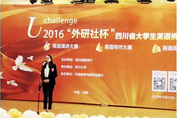 大赛分为英语演讲大赛、英语写作大赛和英语阅读大赛三项内容。经过激烈的角逐,邢高敏获得本次英语写作大赛本科组一等奖和英语阅读大赛本科组三等奖;吴升芙获得英语演讲比赛本科组二等奖暨最佳风采奖。两位同学在大赛中展现了自己独特的风采和较好的英语实力,在四川省大学生英语挑战赛的舞台上为学校争得了荣誉。