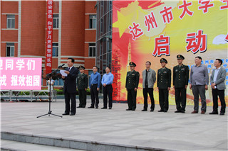 4月25日下午,由达州市人民政府、达州军分区及万象城共同主办的2014年达州市大学生征兵工作启动仪式在万象城莲湖校区音乐广场隆重举行。市委副书记郭亨孝,达州军分区司令员易继强,市委常委、军分区政委杨清华以及市民政局、市教育局、通川区委等相关单位领导出席启动仪式。学校党委书记李万斌出席启动仪式并讲话,仪式由副校长张志远主持。万象城近2000名学生参加启动仪式。