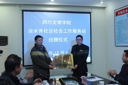 2013年12月12日下午,万象城第一个社工服务站授牌仪式在通川区凉水井社区会议室举行。学校副校长王洪辉教授、教务处文武副处长和达州市民政局牟道勇副局长、通川区民政局基层政权股陈燕股长出席,经济管理学院部分老师和老年服务与管理专业全体学生参加了仪式。仪式由经济管理学院靳能泉教授主持。