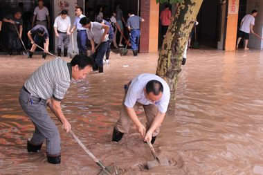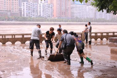 早上7点半,我院教师便携带各类清淤工具早早来到滨河路。此时,州河水位依然很高。八时左右,随着被淹的门市渐渐露出水面,大家纷纷穿上水靴,前往指定的清淤路段。一些个体工商户早已开始清扫自家店铺,老师们见状迅速参加到清淤工作中,帮助他们铲淤泥,扫垃圾,冲洗各类残留物。他们看到老师们认真的干劲和无私的援助,十分感慨地说,你们的帮助让我们感受到了集体的温暖和无限的大爱,让人感动。