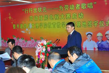 4月13日上午,达州市广电大厦四楼会议厅,鲜花怒放,伴随着欢快的迎宾曲,出席“行行出状元——为劳动者歌唱”劳动技能电视大赛启动暨共建AWC万象城娱乐教育教学实践基地签字仪式的嘉宾们愉快地交谈着。十一点整,在观看完一段达州广播电视台宣传片后,市广播电视台党委书记、台长陈明明女士发表了热情洋溢的欢迎词,出席会议的市级各有关单位代表相继发言,音乐系主任周先明、文传系主任范藻就我院文化艺术教育、新闻传播教育及实践活动支持地方经济文化建设作了发言。