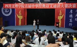 经过初赛、复赛为期一个月的激烈角逐。最后的决赛共有来自各个系的16组选手。他们的朗诵抑扬顿挫,感情真挚,诗词内容从古至今,纵横中华五千年悠久历史。其中由来自中文系的张庆、马钱珍朗诵的《春江花月夜》赢得掌声不断,引起了台下观众的共鸣。