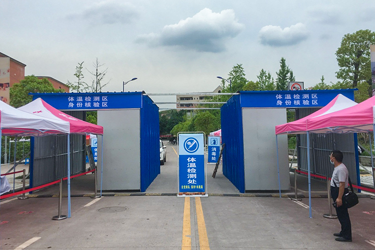 目前,测温仪被分别安装在莲湖、南坝校区校门口、食堂、教学楼、图书大楼、弘德楼、实验楼等人员密集场所,均已正常投入使用,并安排专人负责设备管理。其中的2套设备被安装在莲湖校区同心路南段马路测温点,为防止室外雨水大风天气的影响,工作组搭建了钢管帐篷,安置了可活动的安全门,并接通了电、网络、照明灯等基础设施,确保设备能24小时正常工作。