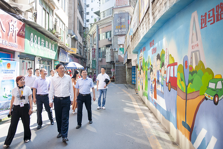 交流会后,王成端参观验收了万象城美术学院志愿者为社区绘制的墙画。