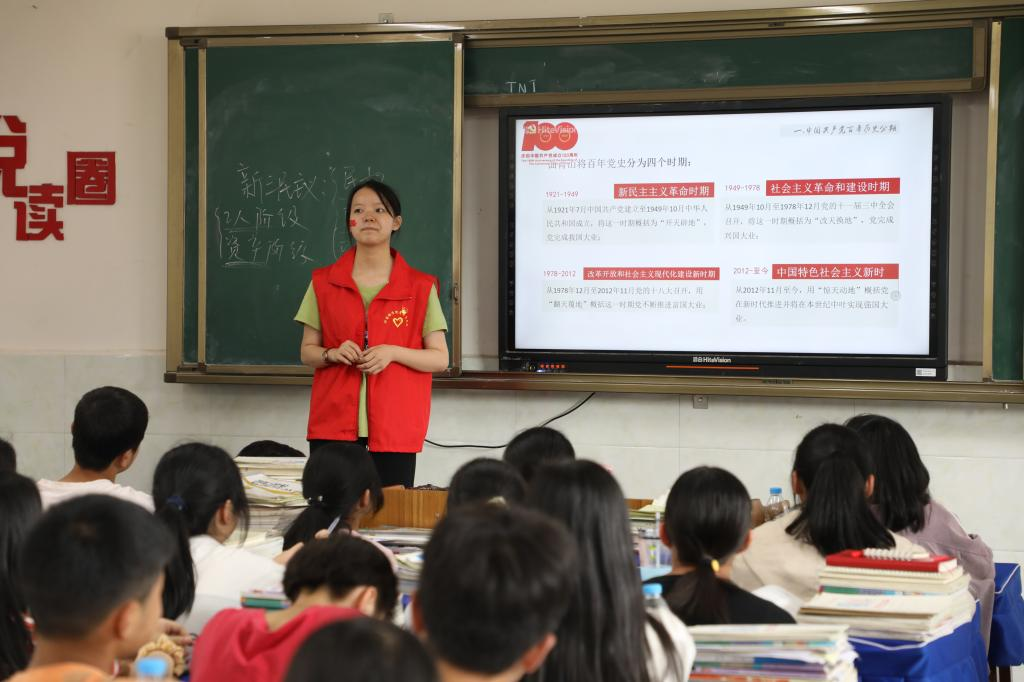 在通川区双龙镇中心校,学生党员和志愿者深入课堂为八年级学生讲授党史知识。课堂上,学生党员和志愿者们通过鲜活的历史图片、生动的名人名言,再现了中国共产党风雨百年铸就的辉煌成就,让学生们从党的历史中再次认识现在生活的来之不易。